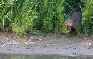 Zo’n burcht is trouwens heel kundig gebouwd langs de oever en dan vaak aangevuld met dam- men om ervoor te zorgen dat de burcht deels al- tijd onder water staat. Het is dat iemand mij aanwees waar de ingang van de burcht te vinden was, anders had ik de eerste keer er zeker over- heen gekeken. Met een beetje mazzel kwam de bever elke ochtend nog ca. 45 minuten vanuit de burcht op de wal klimmen en dan zag ik verderop het struikgewas bewegen en wist ik, dadelijk komt hij met een grote tak terug en die gaat hij ofwel de bast vanaf knagen dan wel meenemen binnenin de burcht (om te verstevigen?). Vaak ging dat op ca. drie vaste plekken. Dit noemt men de beverglijbaan, modderige plekken waar bevers vaak het water ingaan en uitkomen. Bevers leven alleen of in een familie. Zo’n familie bestaat dan uit pa en ma, jongen van een eerder jaar en jongen van het huidige jaar. Helaas heb ik vorige zomer alleen pa en ma kunnen waarnemen.