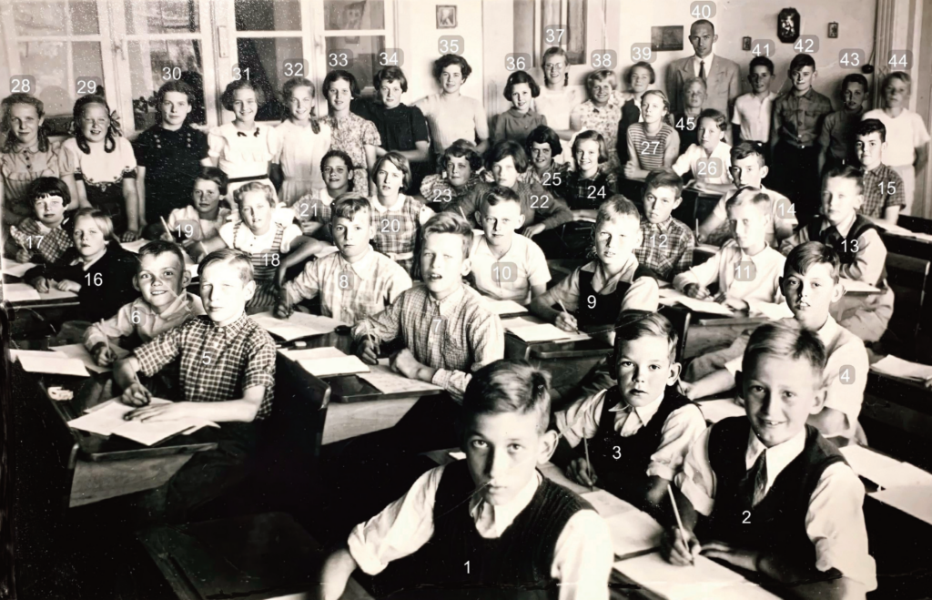 1 Jan van Kempen ( bakker) – 2 Jan Rikken (slager) – 3 Willie Fölker (Sl -Ewijk) – 4 Adrie Mombarg 5 Bennie Veulings – 6 Wim Tijssen (pater) – 7 Albert van Kempen (Balverenlaan) – 8 Fried Daniëls 9 Joke Eggenhuizen – 10 Bennie Smits – 11 Jan Janssen (Kaap) – 12 Willie Thomassen – 13 Harry van Kempen – 14 Willie Daniels ? – 15 Geert van Xanten – 16 Dinie Mombarg (dochter Hent) 17 Ria Dulos – 18 Rikie Houterman – 19 Ria Derkzen (Gansstraat) – 20 Hennie Derkzen – 21? 22 Greet Huisman (Sl-Ewijk) – 23 Annie Mombarg (dochter Ries) – 24 Hennie Veulings ( dochter Ab)- 25 Dinie Mombarg (dochter Ries) – 26 Betsie Peters – 27 Nellie Besselink – 28 Rina Beekhuizen – 29 Nettie Krijnen (Sl-Ewijk) – 30 Dinie Mathijsen (Sl-Ewijk) – 31 Rikie Lintsen ( De Wis) – 32 Truus Krijnen (Sl- Ewijk) – 33 Annie Roelofs – 34 Corrie van den Bosch (Sl-Ewijk) – 35 Thea Hoogsteder 36 Evie Eggenhuizen – 37 Nellie Besselink – 38 Lies Maassen – 39 Annie Wolters – 40 E. Omloo (Hoofdonderwijzer) – 41 Leo Burgers – 42 Eef Tijssen – 43 Bart van Heumen – 44 Piet Teunissen (Sl- Ewijk) – 45 Henk Bouwman (Sl-Ewijk).
